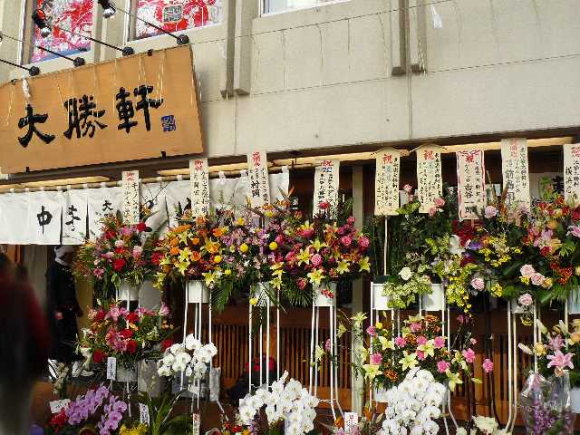 13時過ぎに到着して40人ほどの待ち。その間、振舞い酒やお茶のサービスがありました。また、祝福のお花が多数届きましたが、この数はざっと見ても40〜50はあったのではないかと。大勝軒出身者はもちろん、有名店主からも多数。