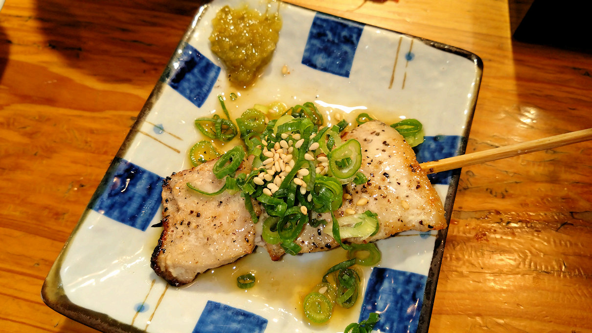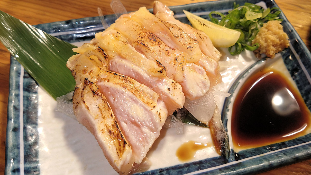 肉厚で、たたきらしく表面の炙り具合もいいですね。鶏のたたきはめったに頼まないのですが、これはいい。