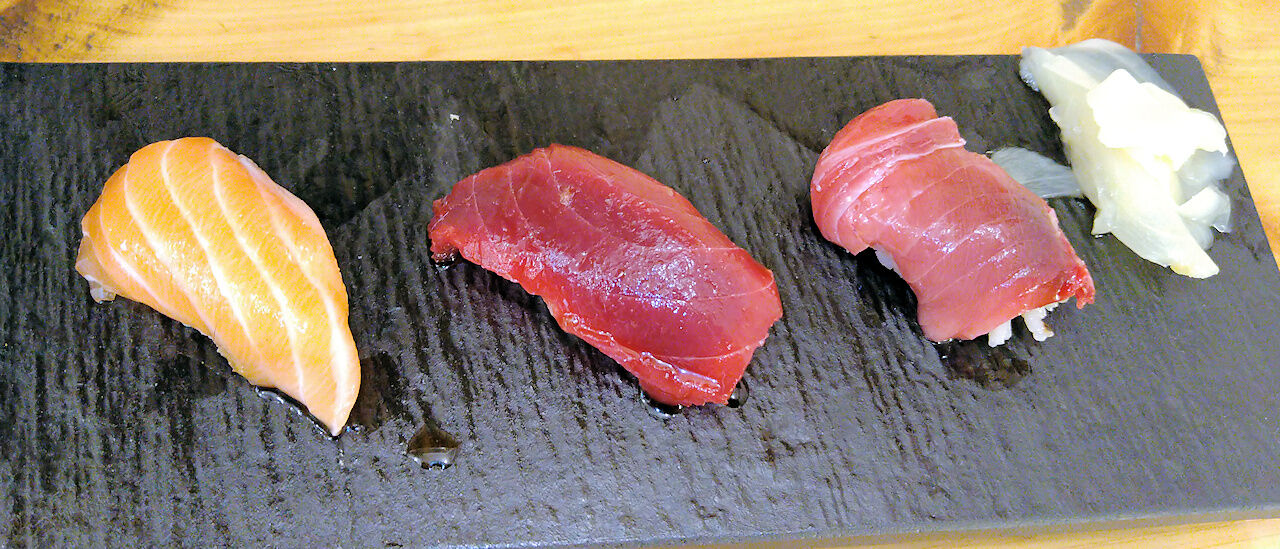 〆は寿司で。ネタの種類は豊富です。殻を見きたての海老の色合いが特徴。イカの方も切れ目の入れ具合がいいですね。赤出汁付き。