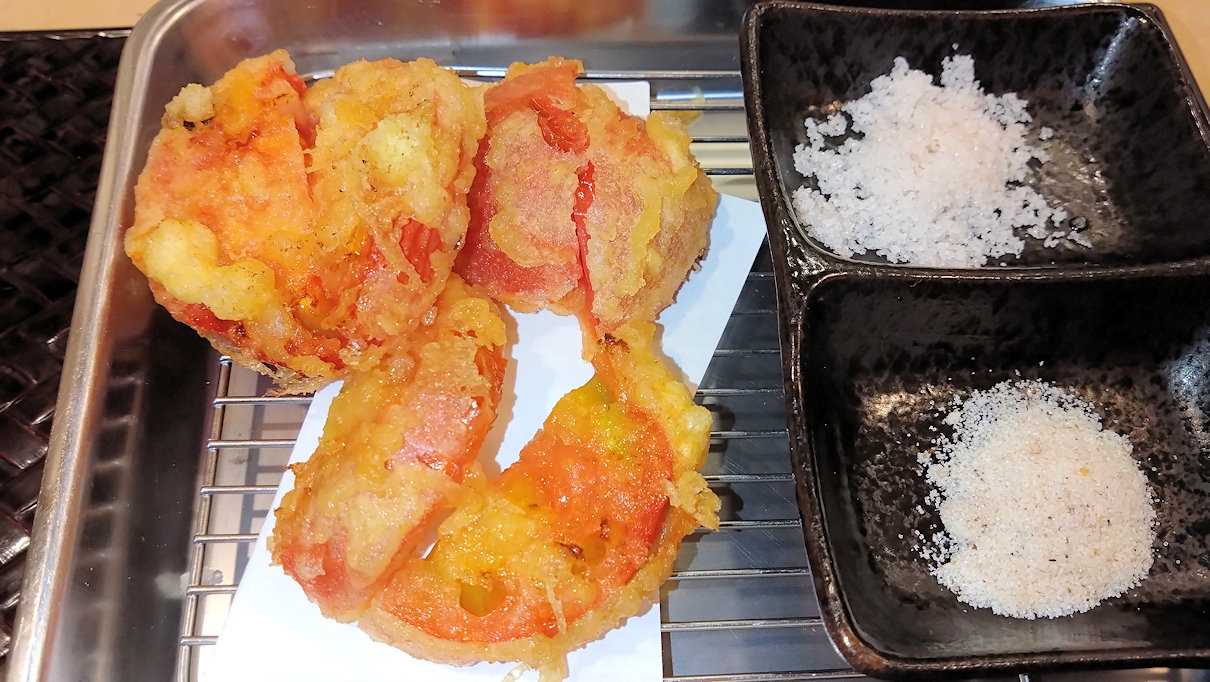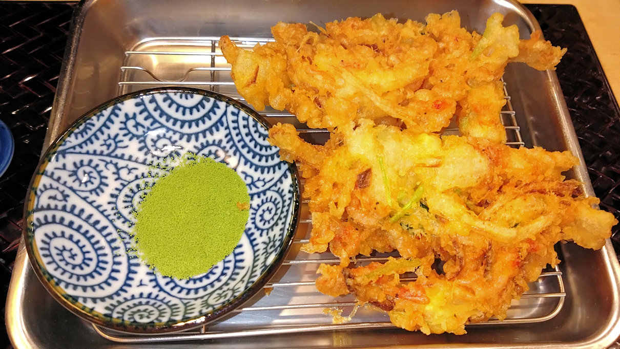 揚げるタイミングもいいんですが、わさび塩がメインというのも素材を生かしていると、いつも感じてました。江戸の天ぷらではおなじみのキスも、塩をつけて食べるとキス本来の味わいを感じます。