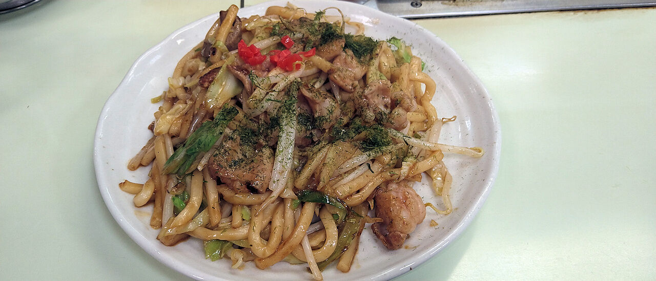 津山名物のホルモンうどん。こちらのお店は広島風お好み焼きのお店ですが、津山名物のホルモンうどんもあります。