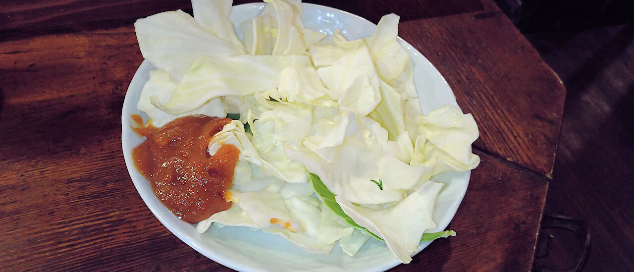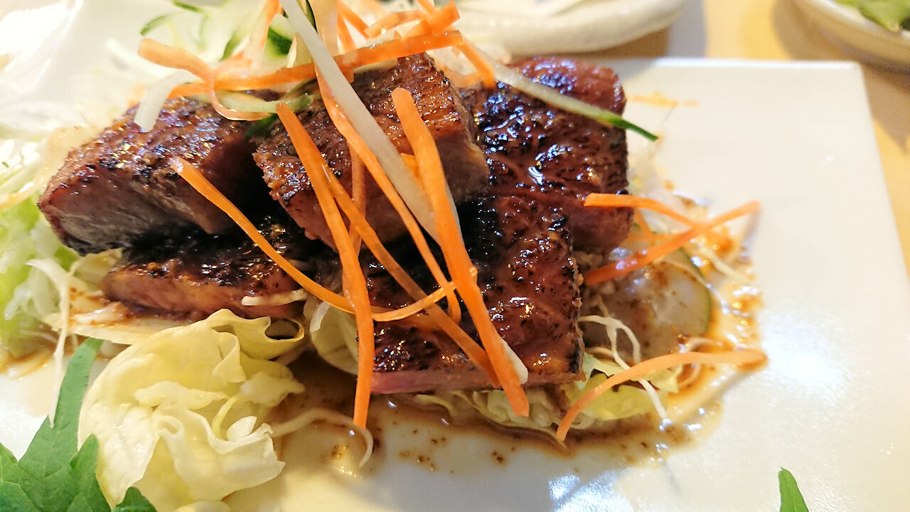 十和田名物の焼肉です。肉ときのこ、たまねぎの量的バランスもいいですがたれでしっかりと焼き上げているのでアツアツ。